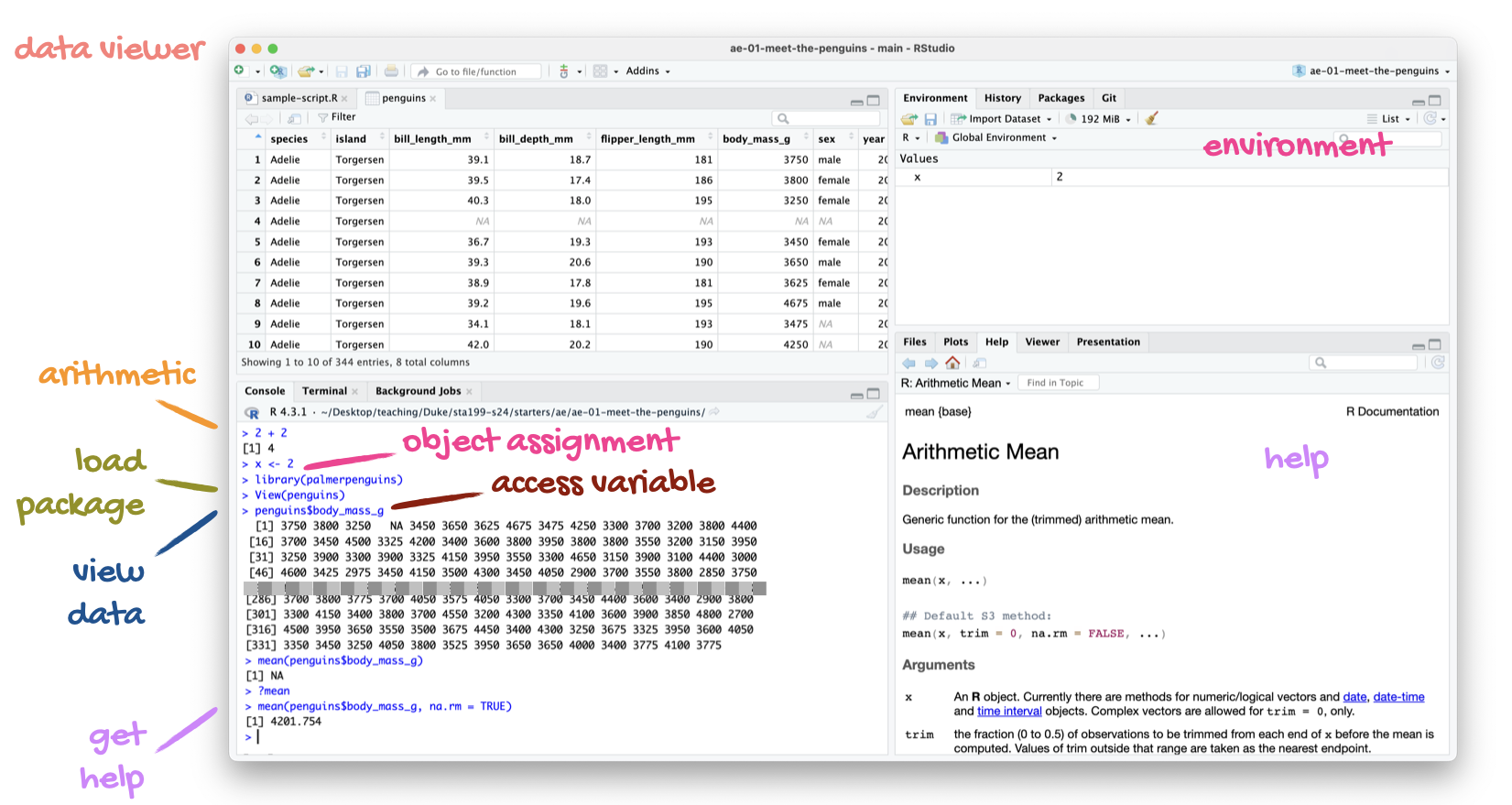 - (bottom right) this panel is multipurpose. Depending on the tab you select, it can display the file directory, the plot you created, the documentation, or your rendered pdf.