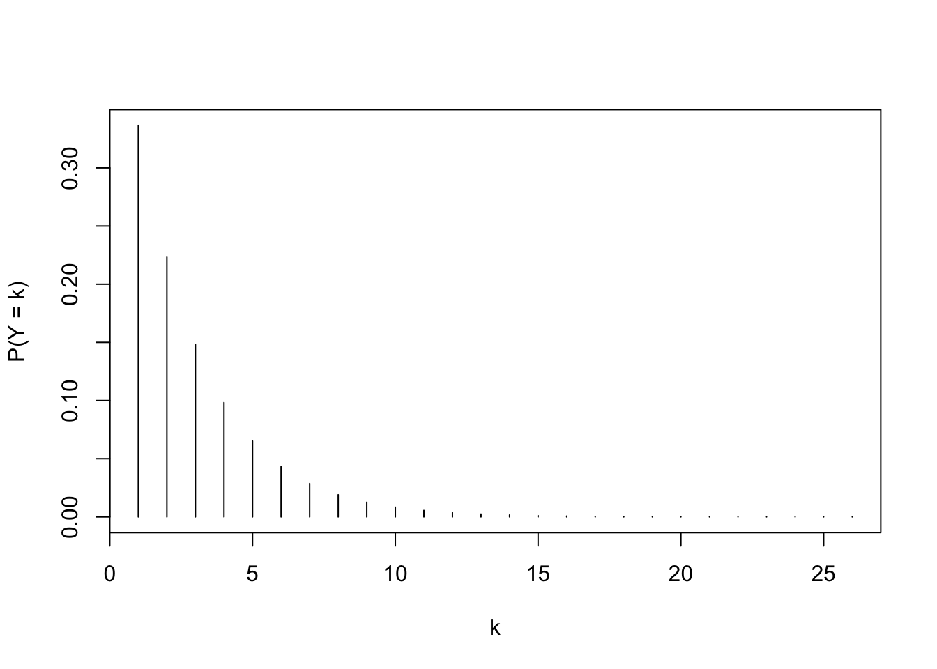 Let’s say that every day, I wake up, pour the coffee, do some lil’ granny stretches so that I don’t break a hip, and then swipe on the app until I’ve sent out my 25 likes for the day. Then I wait to see if any matches roll in. I do this day after day after day. Let \(Y\) be the number of days I have to wait through until I get at least one match.