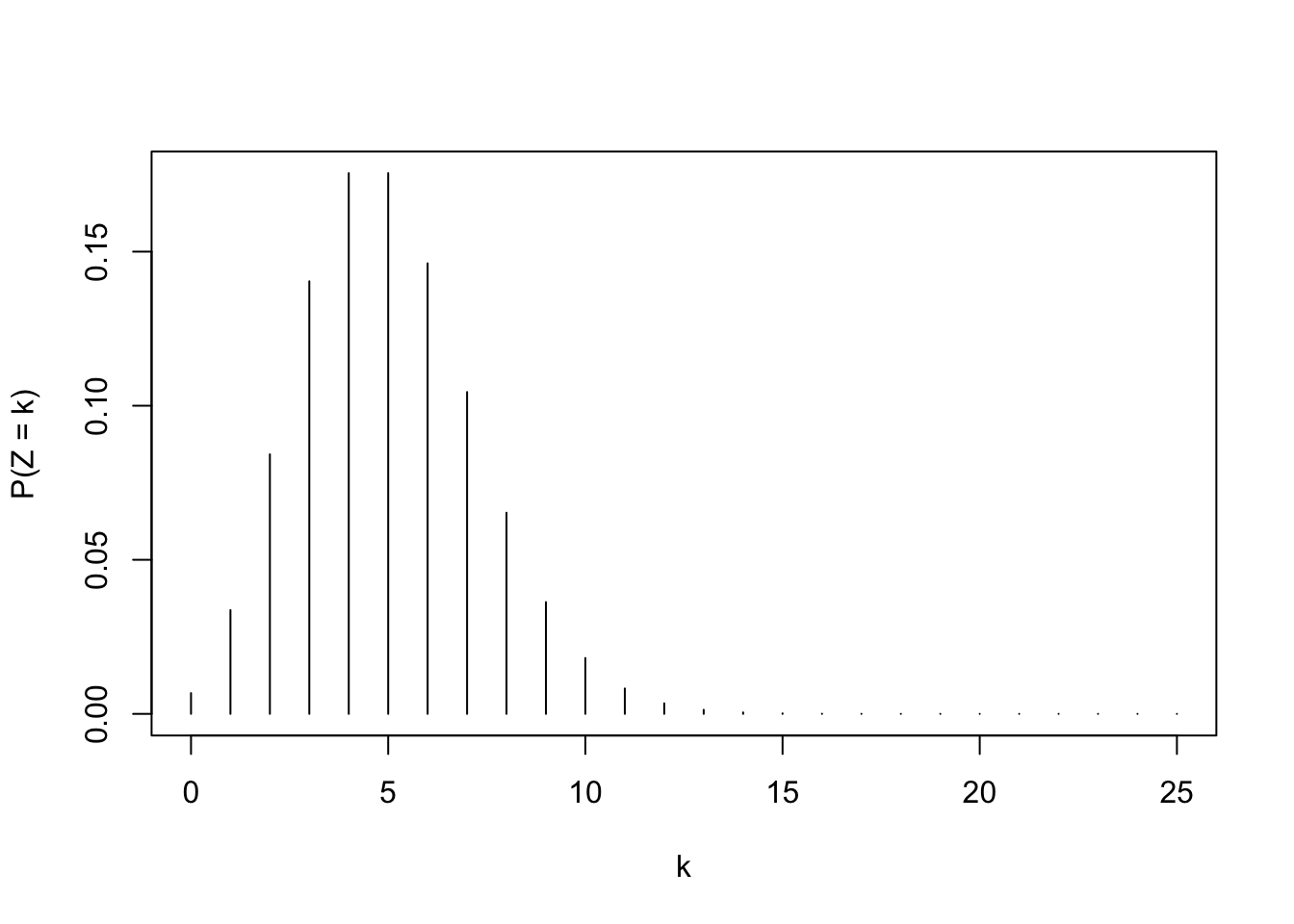For an ordinary person, perhaps \(Z\sim\text{Poisson}(5)\). Use R to compute the probability that such a person beats their average for the day.
