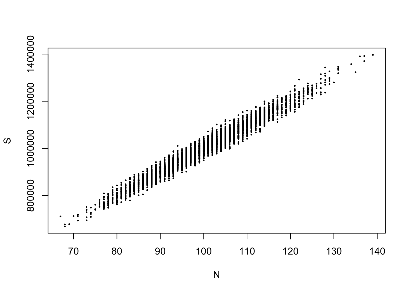Create a well-labeled scatterplot of the pairs \((N,\,S)\) that you just simulated.
