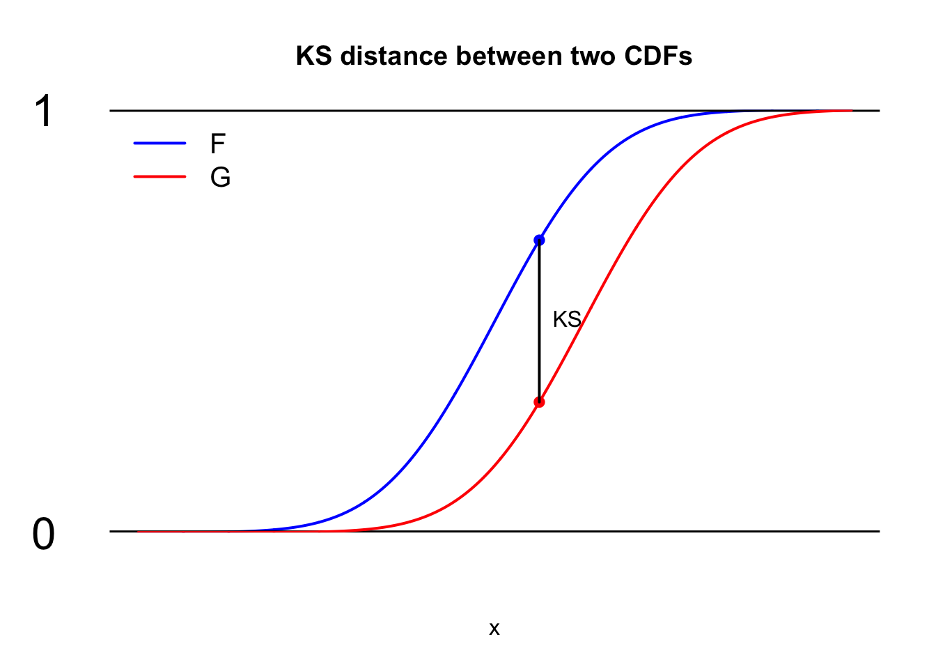 So, you scan from left to right across all real numbers, and you find the point where the vertical gap between the cdfs is biggest. The size of that biggest gap is the KS distance between \(F\) and \(G\).