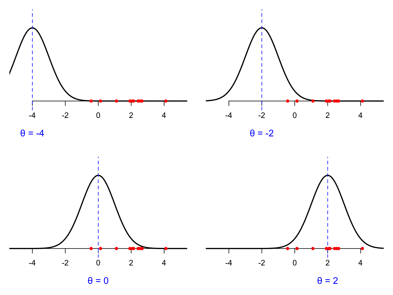 The problem is that we have no clue what the true value of \(\theta\) actually is, so we want to use the observed data to construct a best guess. How do we do this? What do we even mean by “best”? To be concrete, consider data from a normal distribution with unknown mean: