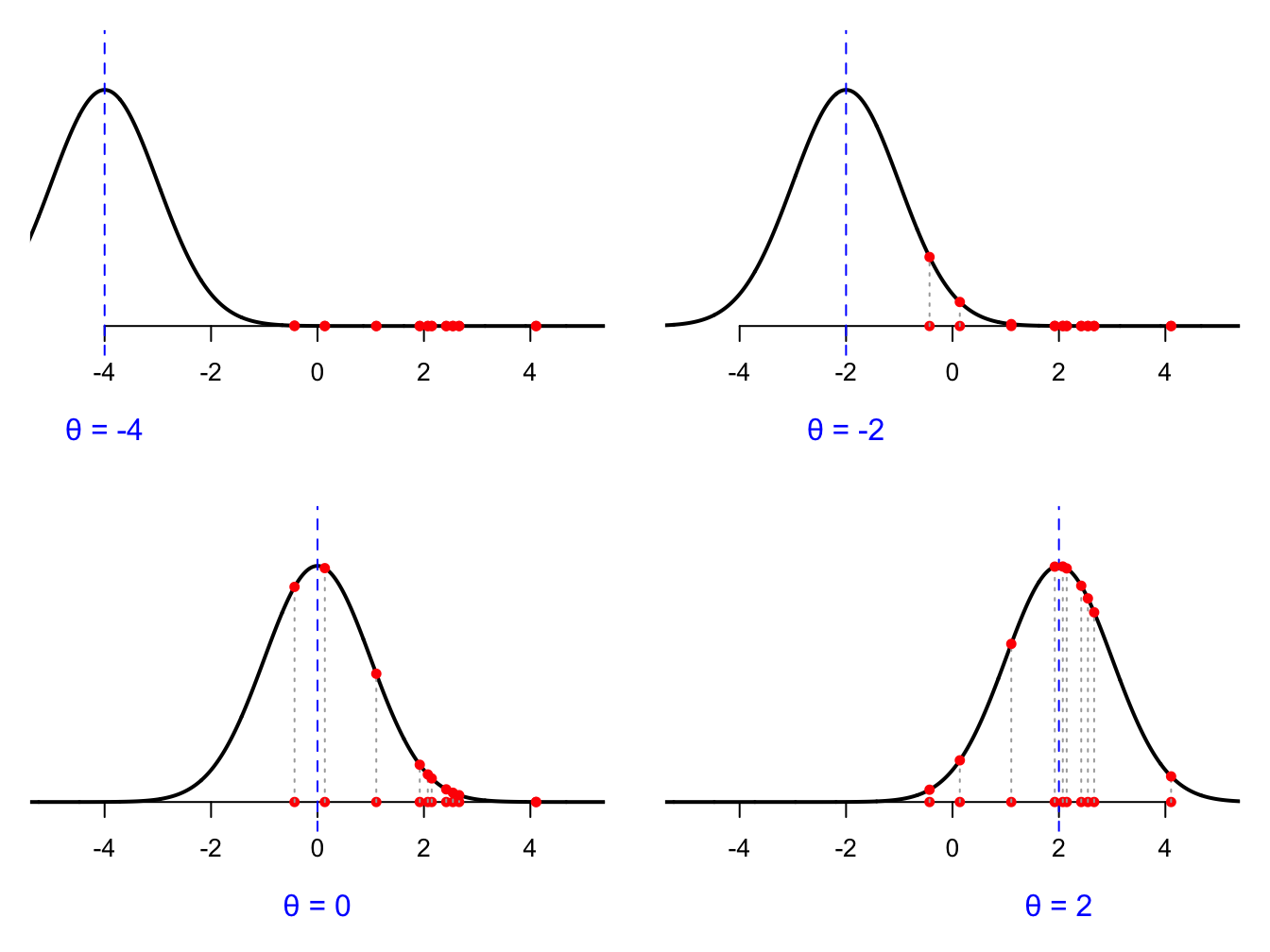We can probably agree that \(\theta = 2\) is best guess among these options. Why? Because that curve assigns the highest density to the data we actually saw (the red dots on the number line). Notice that in each picture, the data are the same. The observations are the observations. The numbers in the your spreadsheet don’t change. What changes is our guess at \(\theta\) and the associated curve. The goal of estimation is to search through all possible values of \(\theta\) and find the one that gives the best fitting curve. How do we measure “best fitting”? We look at the density that the curve assigns to all the data points. Revisiting the cartoons above, for a given choice of \(\theta\), each observation \(X_i\) has a density value \(f(X_i;\,\theta)\) associated with it, and this corresponds to the vertical gap on the picture: