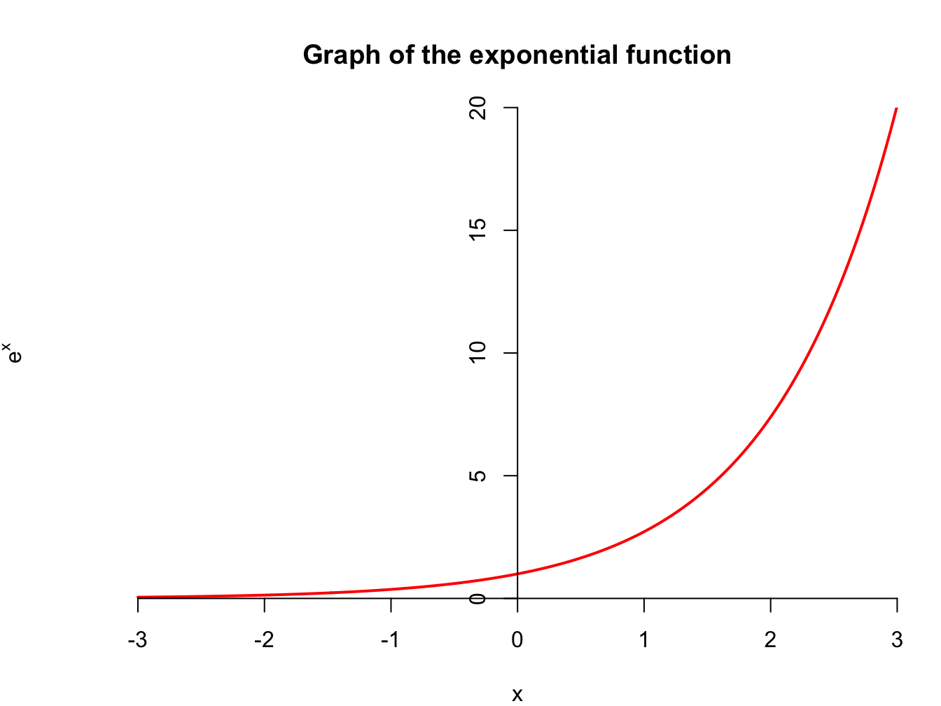 A particularly important function for us is the exponential function \(e^x\), where \(e\approx 2.71828\) is Euler’s number. Because it is defined as an exponent, the exponential function obeys all the rules above: \(e^xe^y=e^{x+y}\), \(e^0=1\), etc.