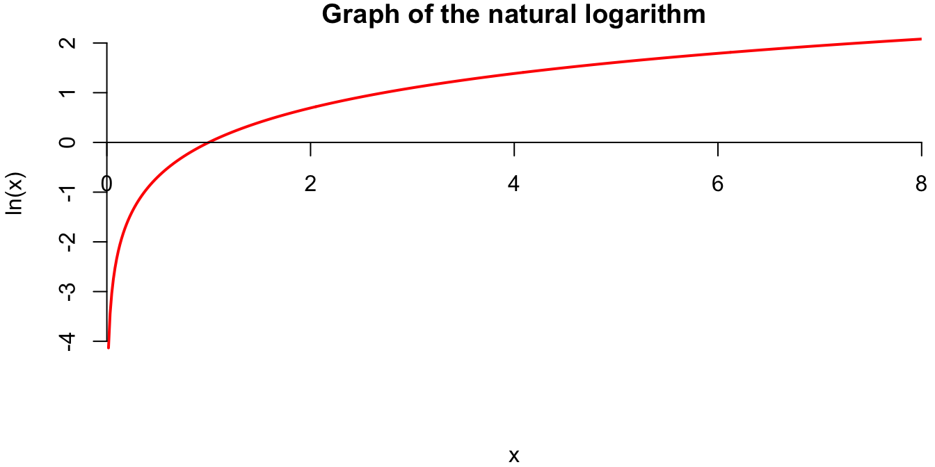 The natural logarithm function \(\ln(x)\) is the inverse of the exponential function \(e^x\). So when we write \(\ln(4)\), we’re asking “\(e\) raised to what power is equal to 4?” Turns out it’s \(\ln(4)\approx 1.386\), so \(e^{1.386}\approx 4\).